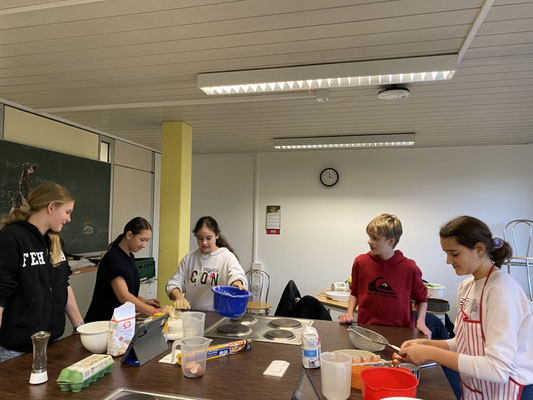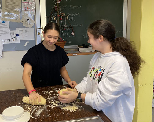 Es wurde geschnitten, geknetet und gerüht, aber auch viel gelacht und probiert. Die Stimmung war super! Es lief Weihnachtsmusik, und alle haben mitgesunden - machmal sogar auf Französisch!