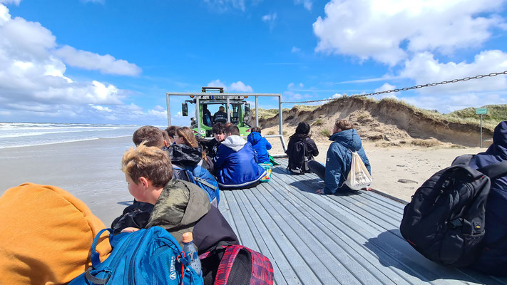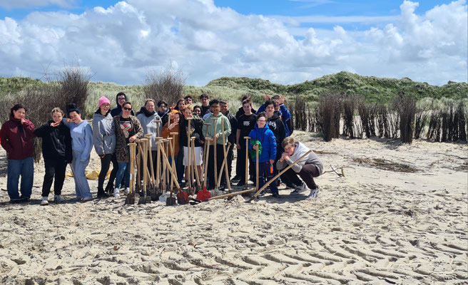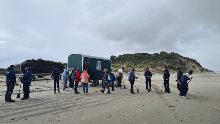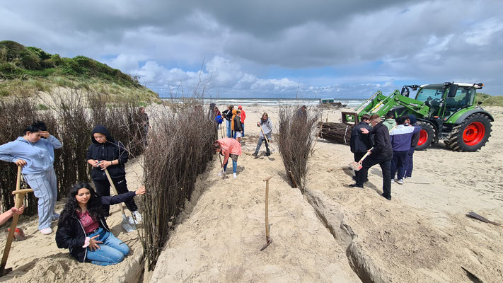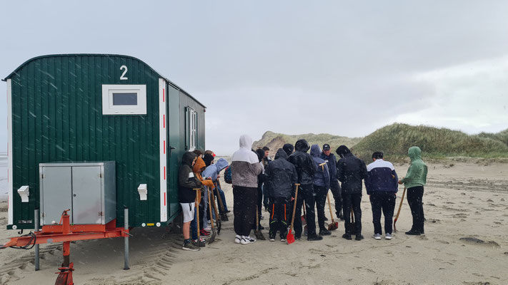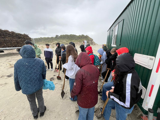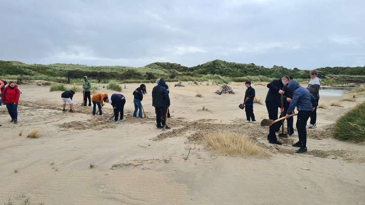 Mittwoch hatten wir dann ungefähr 6 Stunden Küstenschutz. Wir haben mit Schaufeln ganz viel in dem Boden gebuddelt und anschließend Sträucher in den Boden gesteckt, das Ganze haben wir für Sanddünen gebaut, durch diese entstehen mehr Dünen, und diese Dünen schützen die Insel vor beispielsweise Überflutung. Außerdem leben dort viele Tiere.