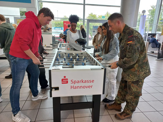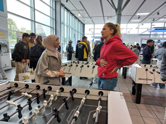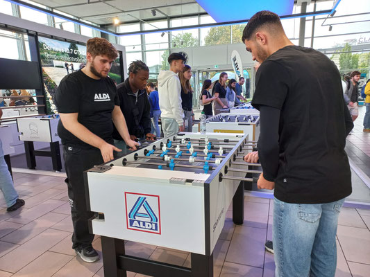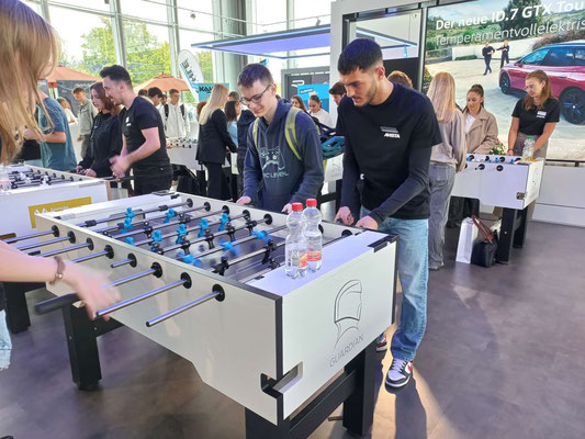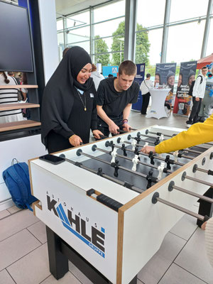 Der Karriere Kick ist eine Ausbildungsmesse der besonderen Art. Hier kommen Schüler:innen und Mitarbeiter:innen spielerisch in Kontakt. Am Kicker-Tisch sind alle per "Du". Im gemeinsamen Spiel mit Mitarbeiter:innen und Schüler:innen auch aus anderen Schulen entsteht eine lockere Atmosphäre, sodass im Anschluss ein entspanntes Gespräch über die Ausbildungsmöglichkeiten geführt werden kann. Wenig später geht es zum nächsten Kicker-Tisch, um die Mitarbeiter:innen eines anderen Unternehmens kennen zu lernen und mit ihnen nach dem Spiel ins Gespräch zu kommen.