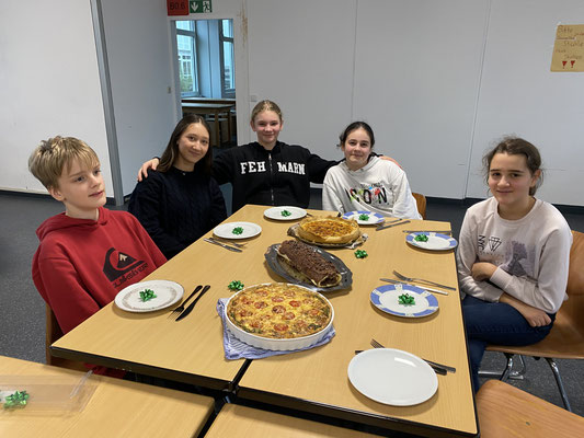 Als die Gerichte fertig waren, saßen die Schüler*innen zusammen und probierten die leckeren Gerichte. Die Quiches waren eifach "manignifique"! Und der Kuchen? Ein süßer Traum!