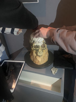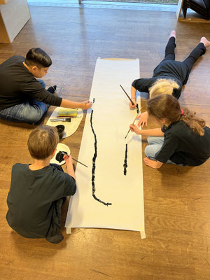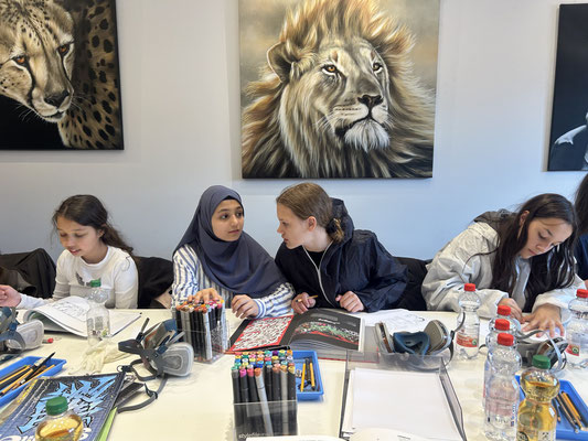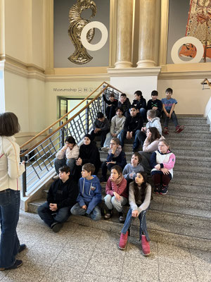"Wir sind mit dem Bus, der Straßenbahn und dem Zug nach Hildesheim gefahren. Da waren wir im Roemer- und Pelizaeusmuseum. Wir haben etwas über Mumien gelernt. Dann durften wir in Gruppen Mumienbilder malen. Die hängen jetzt bei uns im Atelier. Sie sehen lustig aus!" "Am 12.12.2024 waren wir im Landesmuseum. Unser Thema war die Steinzeit. Wir haben eine Führung gemacht und dann durften wir aus Leder und mit Steinen einen Schutz für unsere Hand basteln. So etwas haben die Menschen früher benutzt, wenn sie mit Pfeil und Bogen gejagt haben."