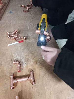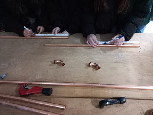 Trotz widriger Umstände - Streik der Busse und Bahnen und plötzlicher Schneefall - machten sich zwei Gruppen des 9. Jahrgangs am 11.02.2025 zu Fuß auf den Weg zur RKS Retzbach Klima Service GmbH in Berenbostel. Die Schülerinnen und Schüler durften in die Büros schauen und haben erfahren, dass sich dieses Unernehmen auf Kälte-, Lüftungs- und Klimatechnik spezialisiert hat. Der Ausbildungsbeauftragte Niclas Höfler erklärte den Schülerinnen und Schülern exemplarisch, welche Tätigkeiten die Mitarbeiterinnen und Mitarbeiter ausführen, erläuterte leicht verständlich, wie z.B. eine Wärmepumpe funktioniert und beschrieb, was ein Fuhrpark ist. Dann durften sich die Schüler:innen selbst ausprobieren. Mit dem Material und Werkzeug, dass sowohl die Anlagenmechaniker SHK (Sanitär-Heizung-Klima) also auch die Elektroniker für Energie- und Gebäudetechnik nutzen, hat jede/r Schüler/in aus Kupferrohren und Fittings einen Kerzenständer gebaut. Der frisch ausgelernte Geselle leitete die beiden Gruppen nacheinander an. Insgesamt bietet die RKS Retzbach GmbH fünf Ausbildungsberufe an.