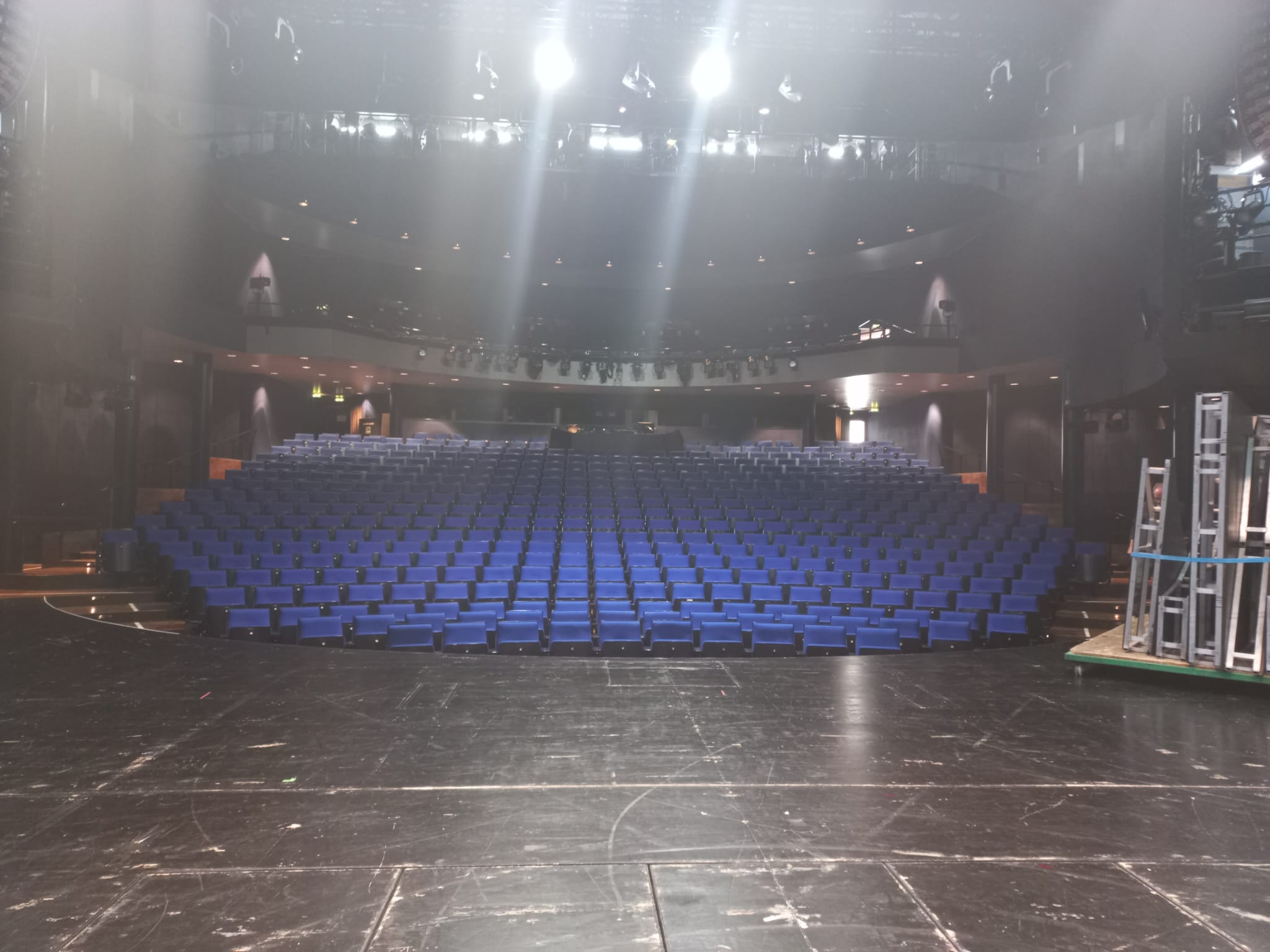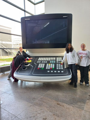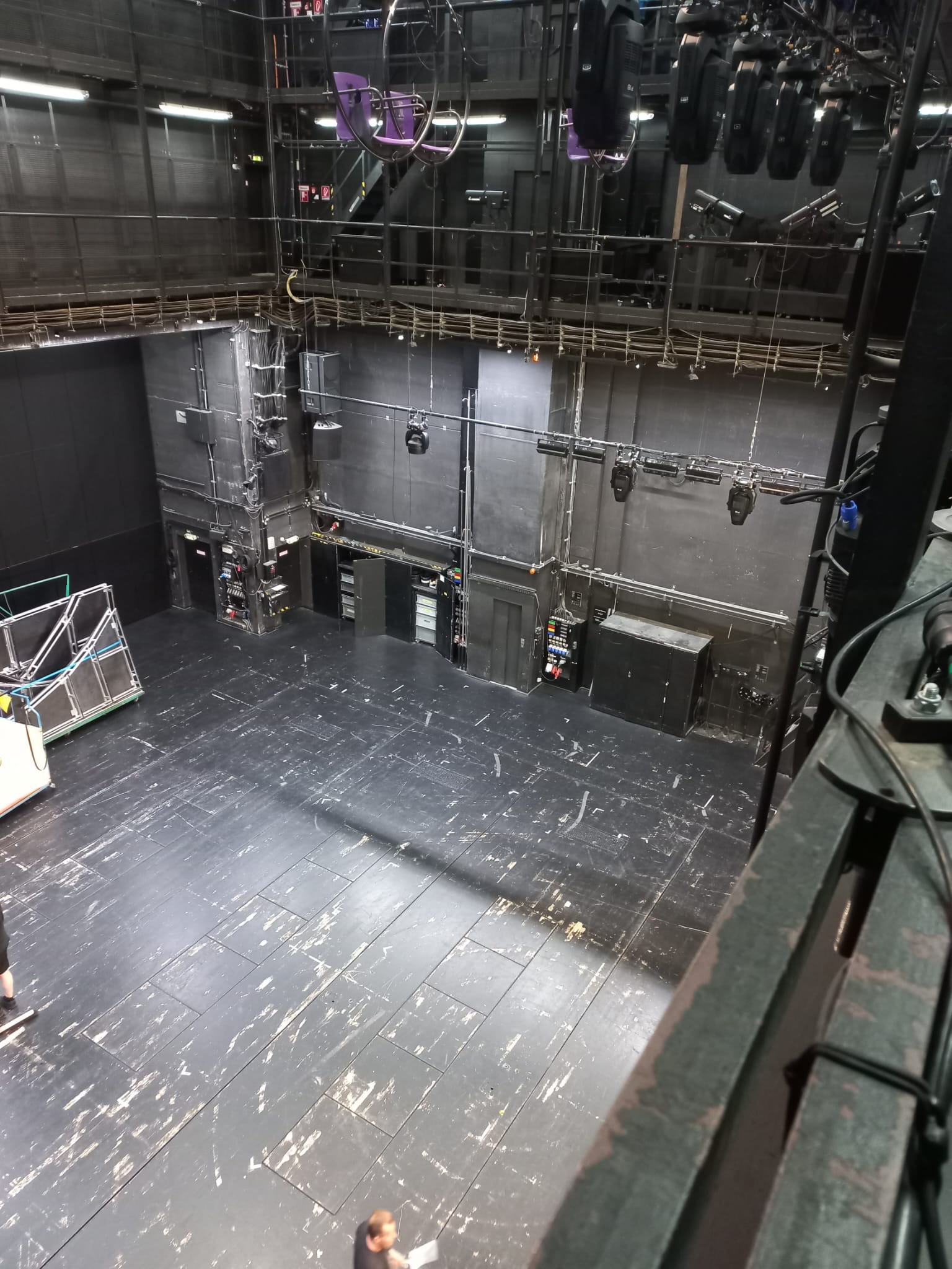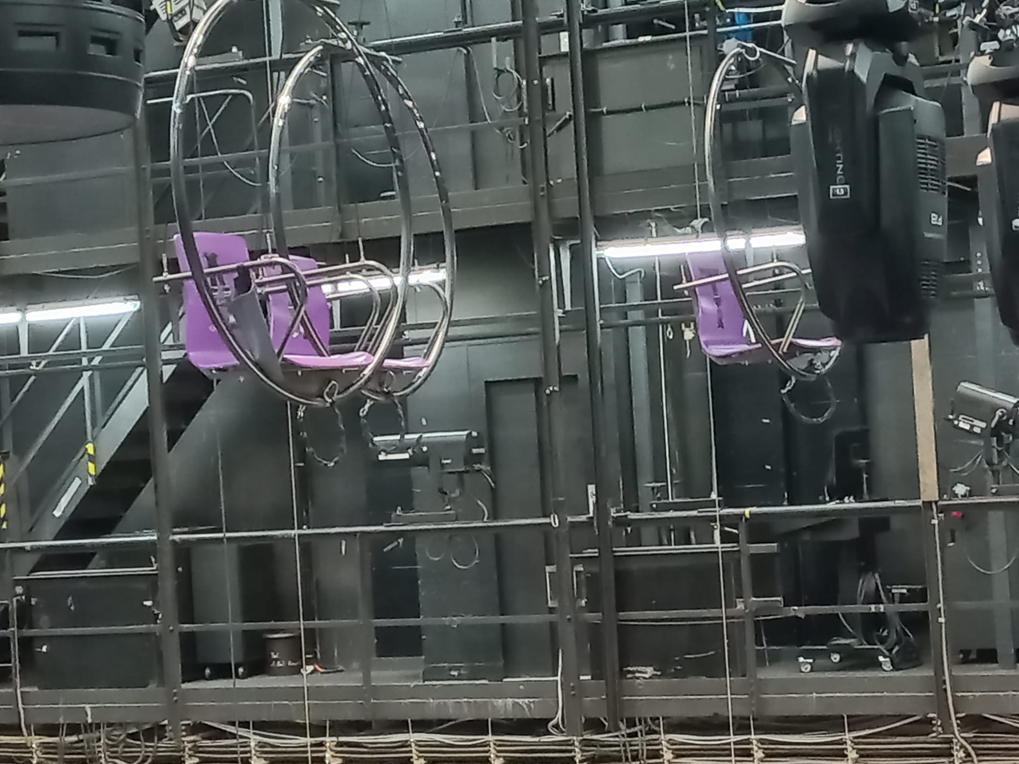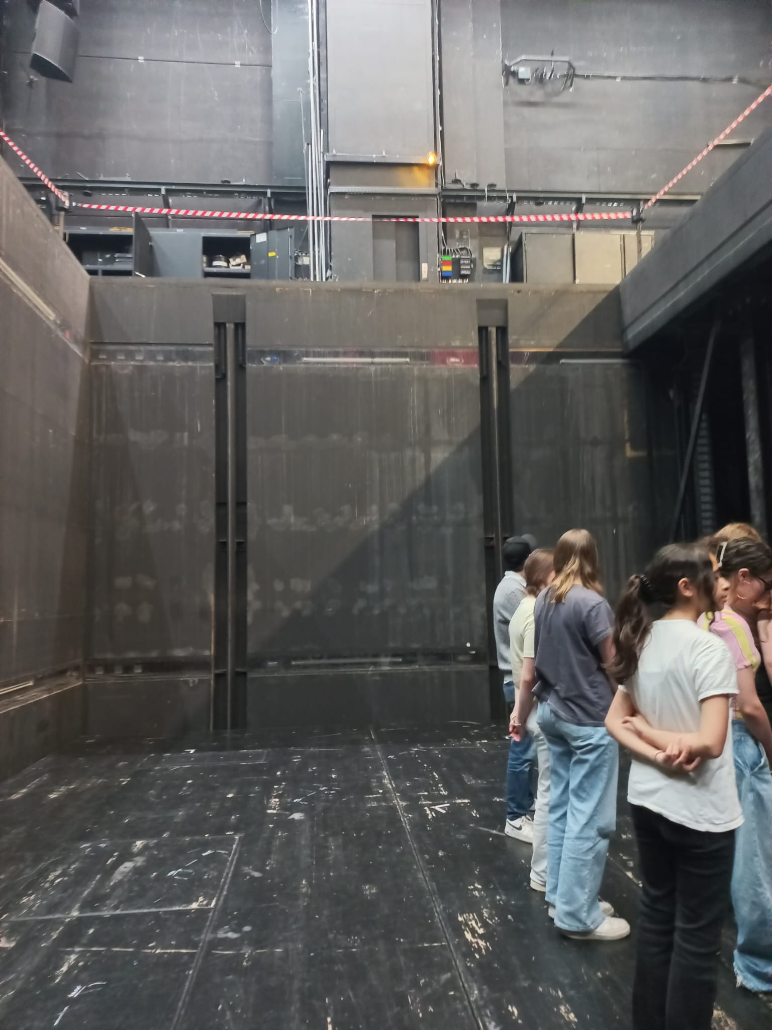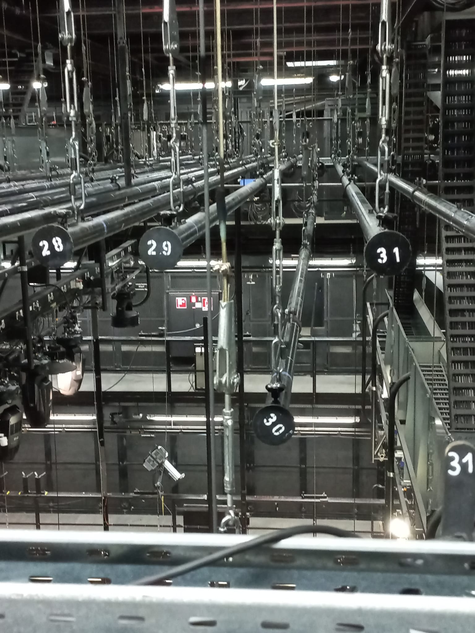 Die Zuschauer sehen nur die Bühne und was sich darauf abspielt. Der Bühnenraum ist jedoch sehr viel größer und erstaunlich hoch. Mehrere Etagen führen ganz oben zu den Rollzügen, an denen Bilder, Vorhänge oder andere Requisiten befestigt und hochgezogen werden können. Der Blick von ganz oben auf die Bühne bestätigt, dass man in diesem Beruf schwindelfrei sein muss. Für unsere Gruppe haben sich die Veranstaltungstechniker:innen einen Überraschung ausgedacht. Wir durften mit dem Bühnenwagen (ein Bereich mitten auf der Bühne) drei Meter in die Tiefe fahren. Diesen Effekt nutzt man, um beispielsweise einen Schauspieler mitten auf der Bühne erscheinen zu lassen.