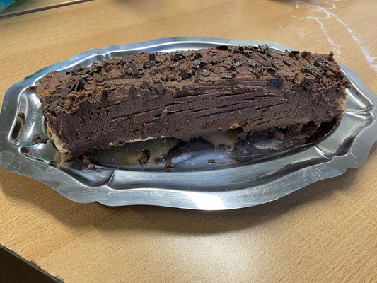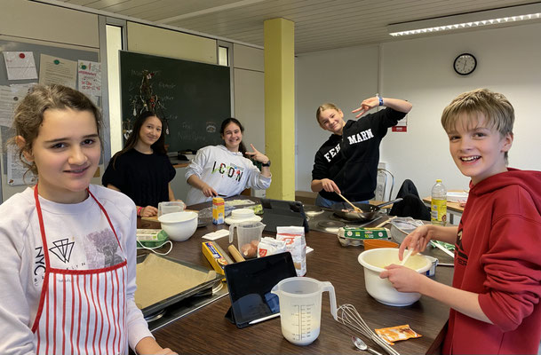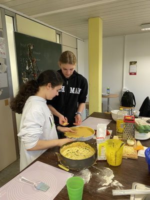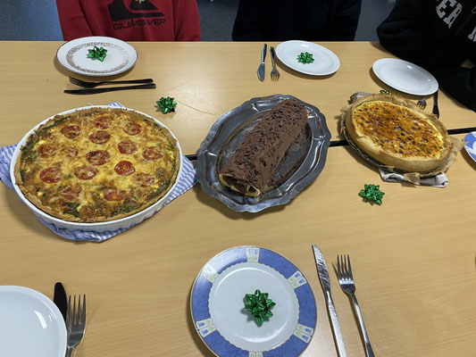Die Schüler*innen haben sich Rezepte ausgesucht und alle Zutaten selbst eigekauft - wie echte Profis! Kein Elternservice, kein Lieferservice, nur Teamwork! Auf dem Speiseplan standen zwei verschiede Quiches (das sind herzhafte Kuchen) und ein Bûche de Noël. Das ist ein berühmter französischer Kuchen, der wie ein Holzscheit aussieht.