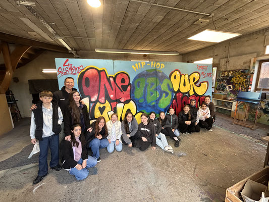Am kommenden Mittwoch, den 2.10.24 feiern wir die Ergebnisse unseres Graffiti- und Hip Hop-Projekts mit einer Vernissage! Die SchülerInnen des 7. Jahrgangs präsentieren stolz ihre Kunstwerke, die unter der kreativen Leitung von Graffiti-Künstler BeNer1 und Rapper Daniel „Knochenhand“ entstanden sind. Wir laden euch herzlich ein, vorbeizukommen und die farbenfrohen Wände, die Themen wie Natur, Weltraum, Religion, Sport und Tiere zeigen, zu bewundern. Lasst uns gemeinsam die Kreativität und Vielfalt feiern!