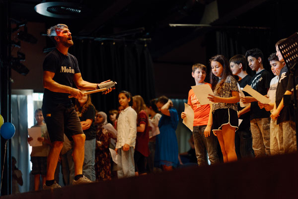 Wir haben ein Theaterstück aufgeführt, es gab Gruppen und jede Gruppe konnte sich etwas Eigenes ausdenken. Ich war in der Musikgruppe, wir haben sehr viel für unseren „Perfekten Tag“ und die Aufführung geprobt. Das hat sehr viel Spaß gemacht, ich habe mit Fatih am Klavier gespielt. Wir haben alle zusammen auch ein Lied gesungen, was zum perfekten Tag passte. In der Aula haben sich alle Gruppen gegenseitig ihre Ergebnisse vorgestellt und am Ende alles in einem Stück in der Aula aufgeführt (Ipek).