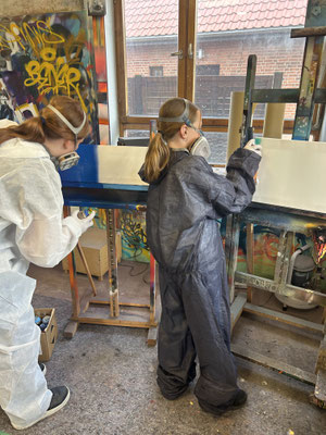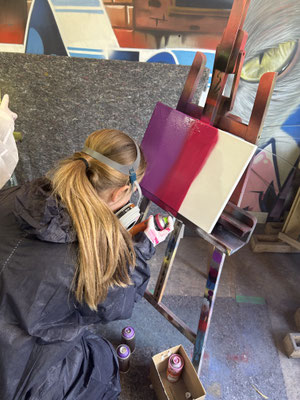 Während die eine Gruppe am gemeinsamen Graffiti sprayte, hat die andere Gruppe ein eigenes „Tag“ entworfen, jeder konnte seine eigene Leinwand gestalten, diese wird dann im Verlauf der AG mit dem persönlichen „Tag“ versehen.