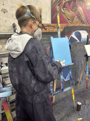 Am Montag, den 05. Mai 2025 war es mal wieder so weit, die Graffiti-AG der OBS Berenbostel hat sich im Atelier des Künstlers BeNeR1 (Patrik Wolters) getroffen. Der Einblick hinter die Kulissen, die Erklärungen und die Entstehung ist immer wieder spannend. Dann ging es für die erste Gruppe an die Übungswand zum Sprayen. Mit ein wenig Unterstützung haben alle Kids schnell Fortschritte gemacht, der erste Teil eines großen Graffitis konnte erstellt werden. Alle Kids waren sehr zufrieden mit ihren Ergebnissen. Die zweite Gruppe vervollständigte das Werk dann, es wurde ein sehr cooles Graffiti.
