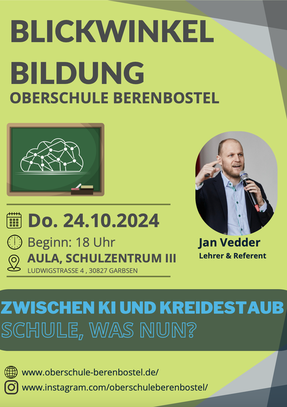 Die Oberschule Berenbostel veranstaltet am Donnerstag, den 24. Oktober 2024, um 18:00 Uhr in der Aula des Schulzentrums III in Garbsen die nächste Ausgabe der Reihe "Blickwinkel Bildung". Thema der Veranstaltung ist "Zwischen KI und Kreidestaub - Schule, was nun?".